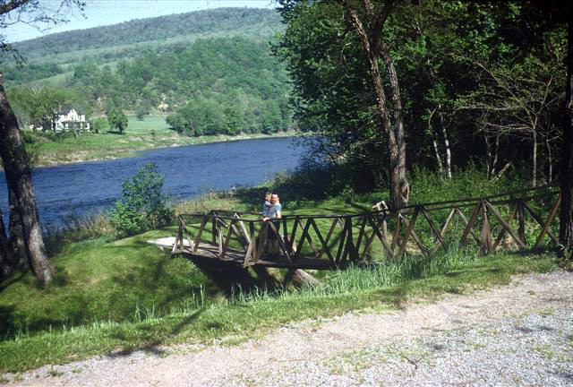 Don standing on the suspension bridge, holding Mark.