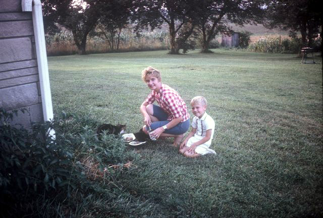 Marilyn with Mark at his Grandma Gray's place in Kentucky. Don says the outhouse in the background is a one-holer.