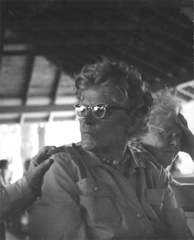 I still don't recognize the person behind Grandma. Uncle Don says it might be Aunt Madeline, but I have a dim memory that it was an older relative, and that the hand on Grandma's shoulder belonged to the relative's mate. The ghostly figure in the far left background is, I believe, Elaine. You might wonder how I could discern this from such a fuzzy image. The answer is that somehow the image feels like Elaine -- or perhaps, on some level, I simply remember that she was standing there. I also have a photograph of Granddad taken less than a minute later. He was sitting by himself on a concrete wall outside the pavilion, with his thin, khaki-clad legs stretched out in before him (did he always wear khakis, or am I imagining this?) and his hands in his pockets, daydreaming. I can still see him in that moment, plain as day, but I have not actually laid eyes on the picture for many years. It is lost somewhere in my files. -- Terry |