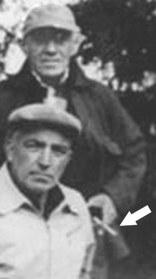 cigarette; it is in front of his index finger instead of behind it; and it seems to be jutting from the center of a