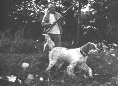 (According to a book on bird dogs that I read many years ago, the Wehles were the family behind Genesee beer. "Jenny," as the locals call it, is popular on Pine Creek. But the only beer I ever saw Granddad drink was Rolling Rock, out of 7-ounce "pony" bottles. He did this rarely and discreetly: Grandma was a charter member of the local Women's Christian Temperance Union. She was not particularly zealous about it, however. She occasionally quoted the WCTU dictum, "Lips that touch liquor shall never touch mine" -- but always in jest.) "I can’t remember the name of the dog in this picture," says Uncle Don, "but the gun Dad is holding is of historical significance. It's a Winfield Scott 12-gauge with damascus barrels. Dad said it was the first series of hammerless 12-gauges Winfield Scott ever made." If I remember rightly, the front sight of this antique was a pearl. When firing the gun, Granddad used specially loaded, low-power shells, to avoid damaging the barrels. Damascus steel (I hope this is correct) was made by weaving fine wire into a tube, and then fusing it in a furnace. Nowadays, of course, gun barrels are turned and bored from solid steel rods, and are much stronger. This picture was probably taken in late July or early August, as the dog is surrounded by the sudsy blooms of Queen Anne's lace. -- Terry |