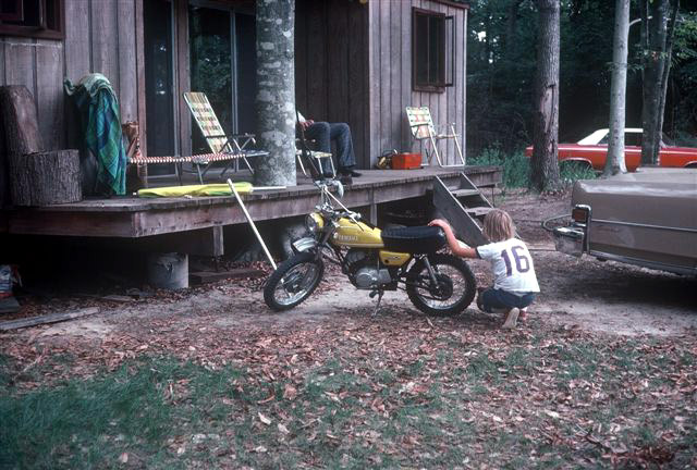 Tom and his motorcycle at the Bethany Beach cabin. Those are Don's legs on the porch, and his '65 olds and the Lincoln in the yard.