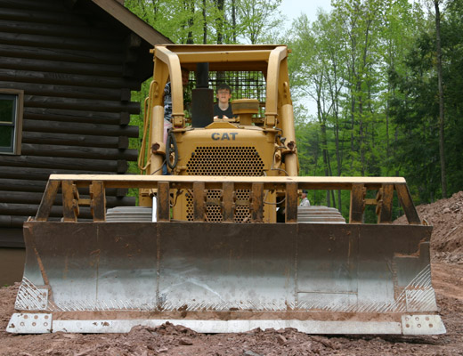 ...from a log cabin someone had built. Here, Tom mans the controls of the bulldozer that had apparently cleared the site.