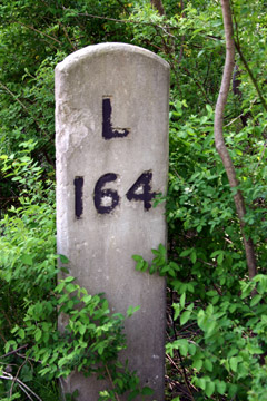 When I was a kid walking along the tracks near Wilbur Moore's house, I imagined this was the gravestone of someone named Larry who died at age 164. In fact, it's a railroad sign. (Anybody know what it means?)