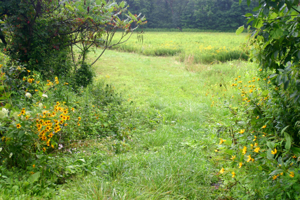 Meadow entrance with wild sunflowers, seen from the bike path north of the Black Bridge