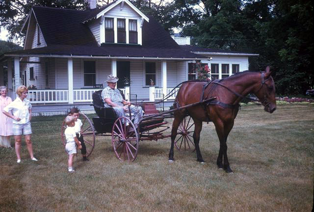 Farmer Speed Eckel on the east lawn, with Faith, Marilyn, Mark, and Doug. (Anybody know the horse's name?)